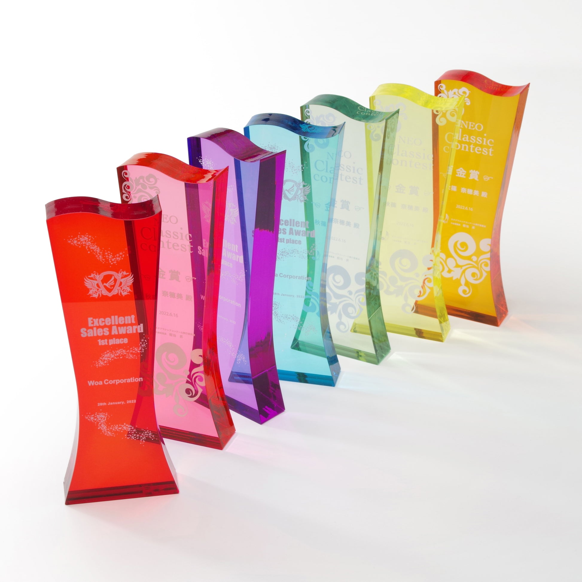 厚さ25mmがかもし出す重厚感と、優美なウェーブカットの融合がみごとなアクリルトロフィー。独自技術によりアクリルに華やかな色を持たせ、透明感をほどよく残しながらも存在感は抜群。功績と感謝を7色の輝きで表し、多様性の次代をふまえ表彰の多様性にも対応。多彩にそろう色展開からコーポレートカラーを選ぶのもすてき。