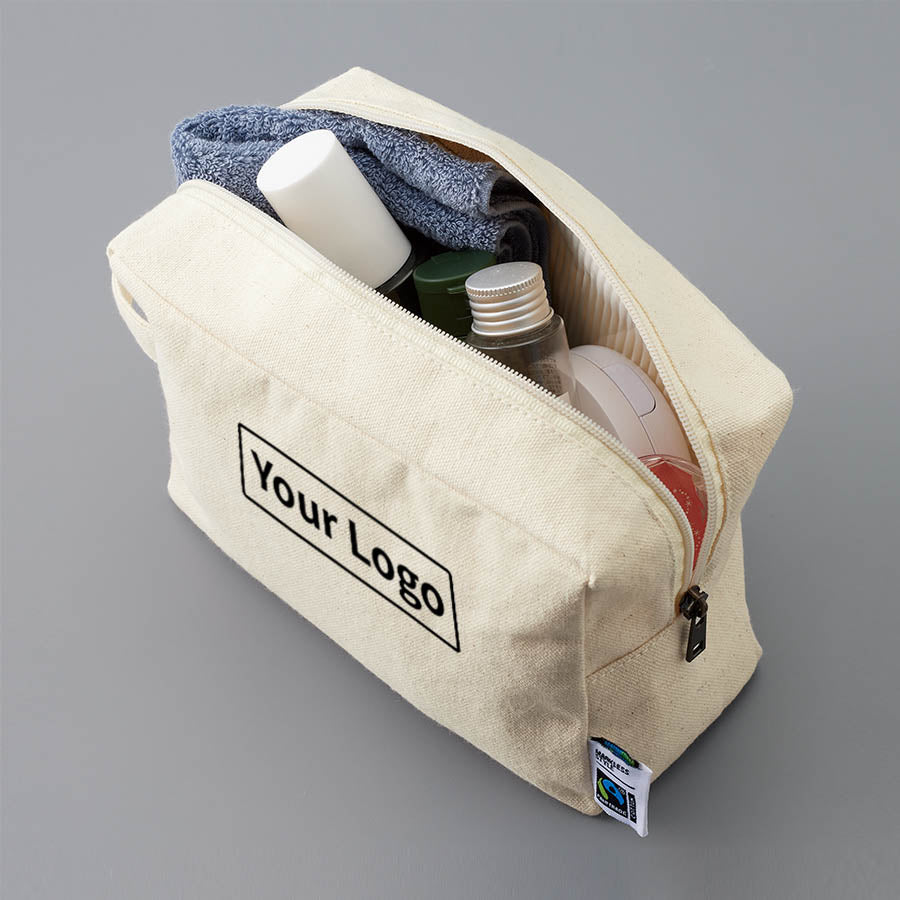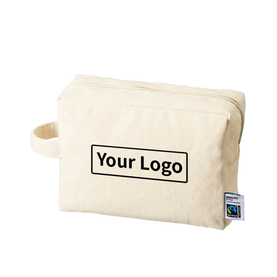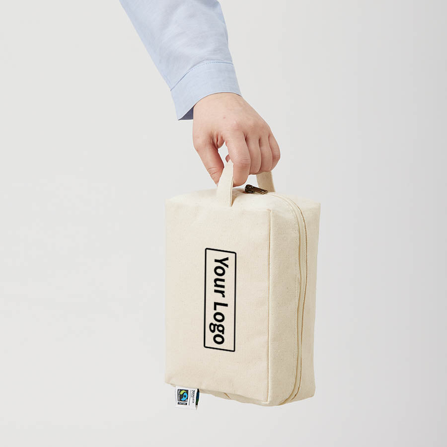 フェアトレードコットンを使用したキャンバスポーチ。国際フェアトレード認証ラベル付きで、SDGsやサステナブルへの取り組みで企業価値をアップ。 スクエアタイプの長方形ポーチMサイズはバッテリーなどのギア、ステーショナリー、コスメなどの収納にぴったり。アクセントとして付いたハンドルは持ち運びにも便利。