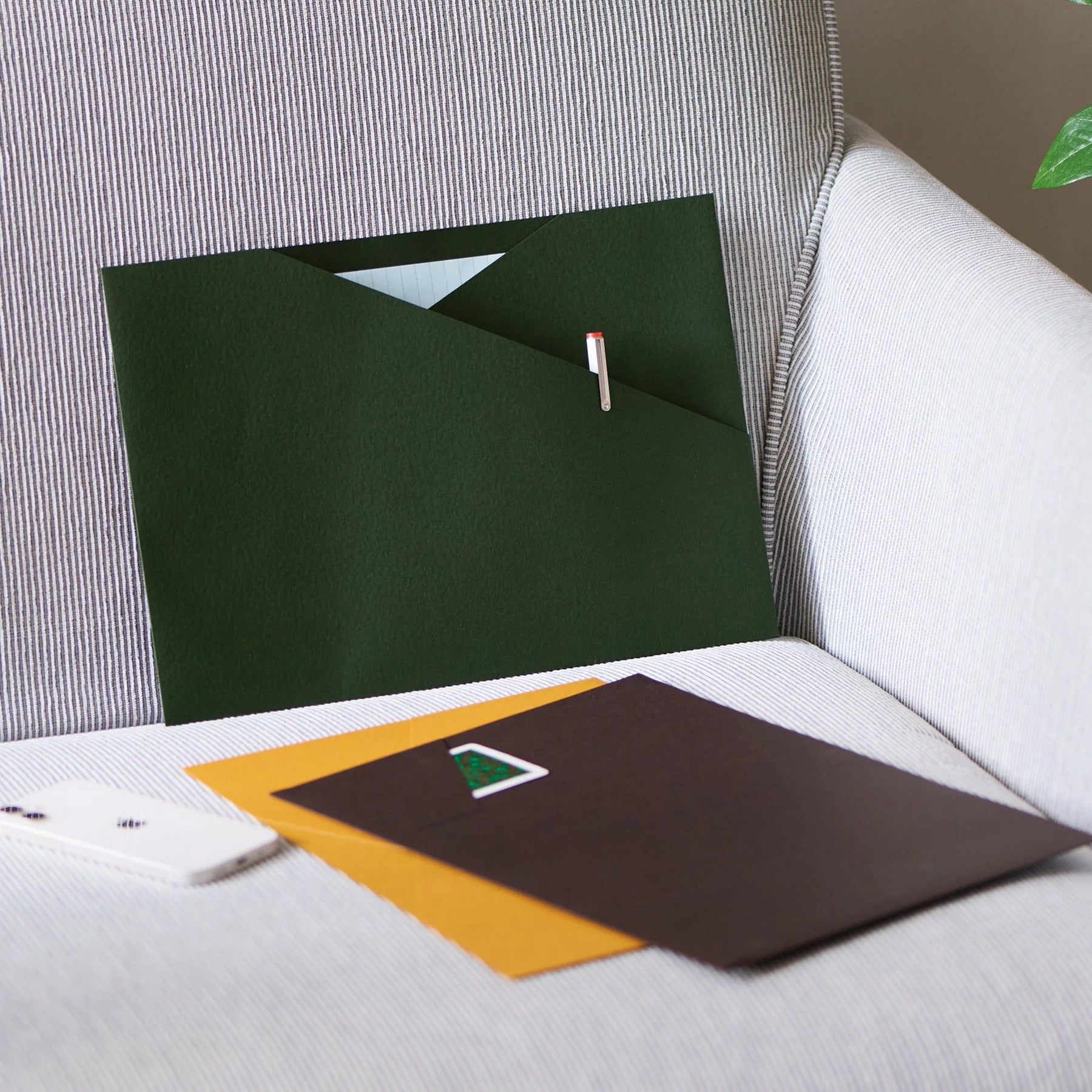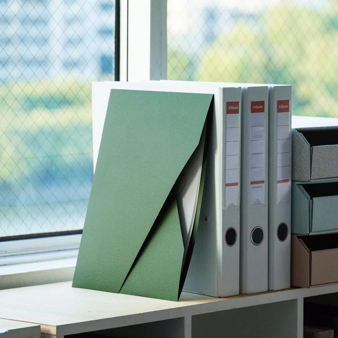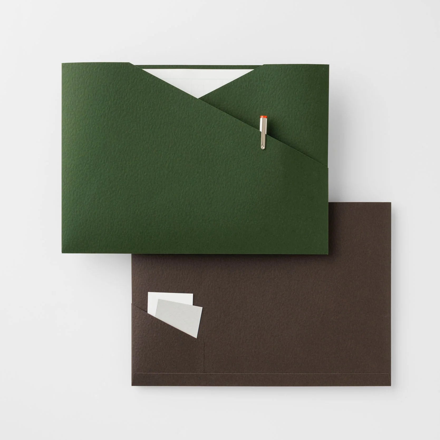 環境にやさしいサスティナブルな紙製書類ファイル。書類を入れたときの見え方にまで配慮し、風合いがあり高級感のある紙を用いることで上品な佇まいになるよう設計。折り重なった紙が仕切りとなり、書類などを分けて保管することも可能。背面にはカードを収納できるポケットもあり、名刺やショップカードの整理にも便利。