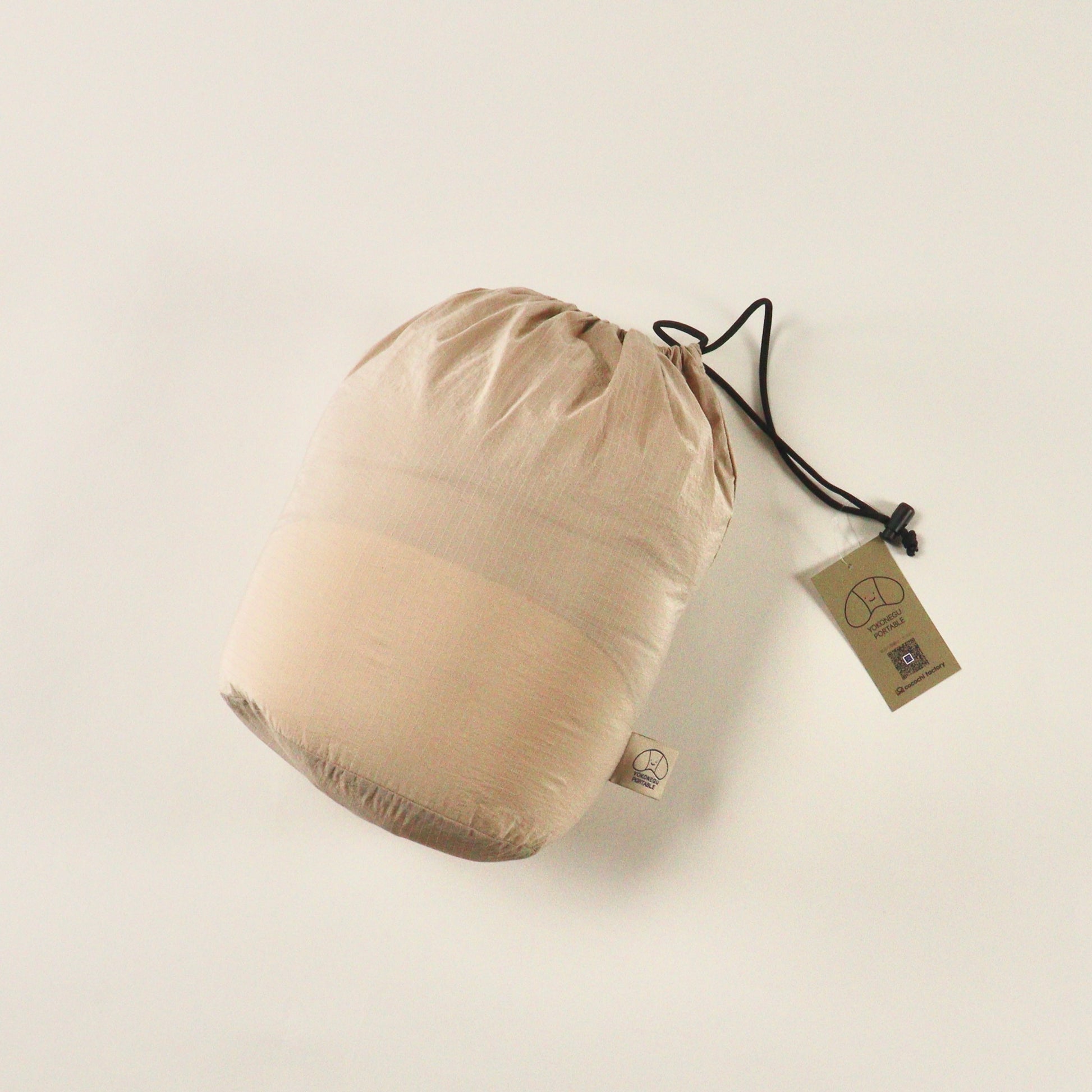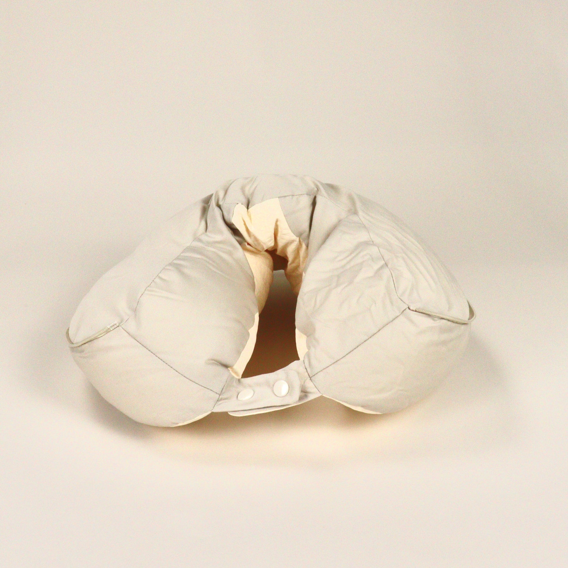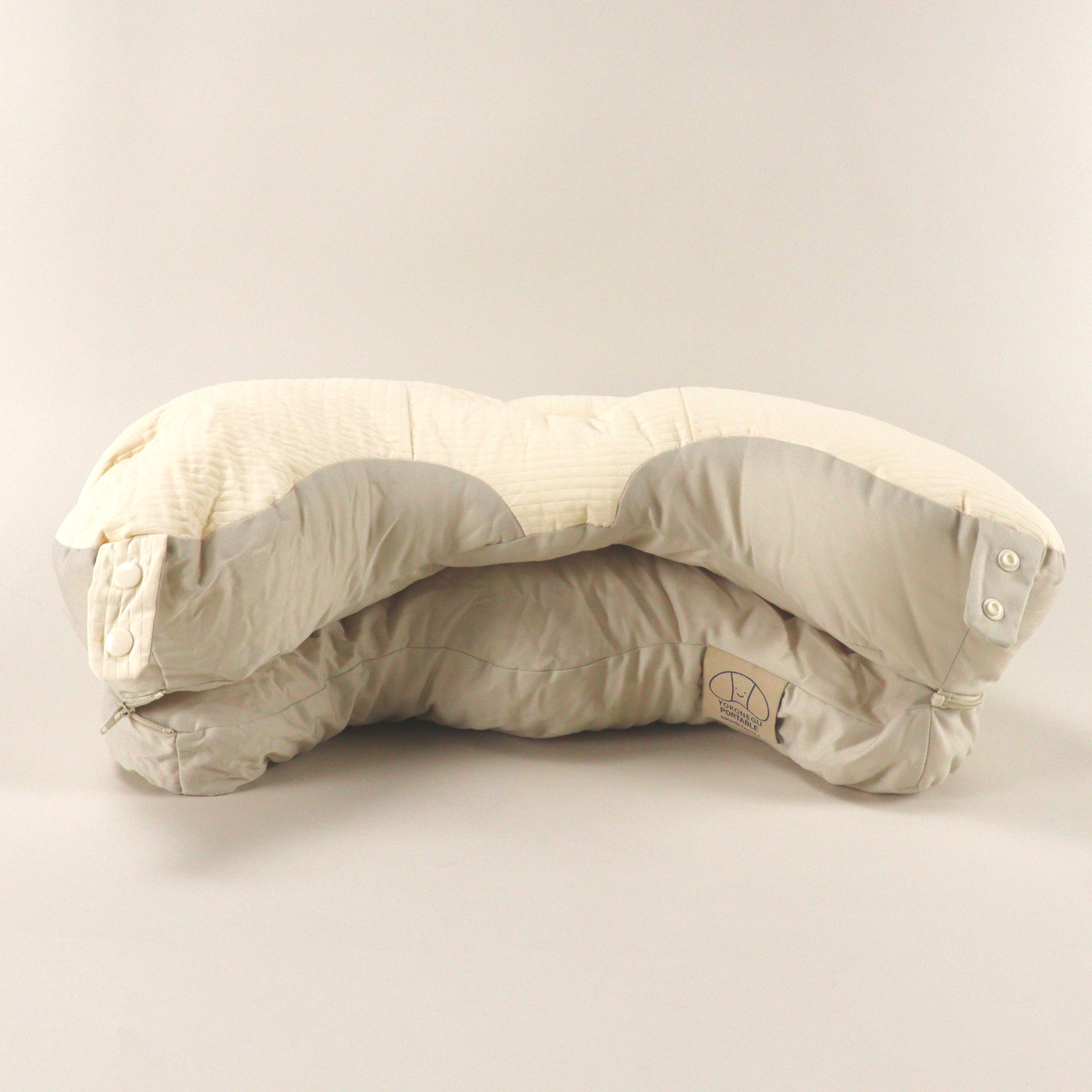 人間工学に基づいた特殊ブーメラン形状を採用し、人によって異なる横寝の姿勢にぴったりフィット。特殊二階建て構造が生み出す「腕肩ポケット」が腕にかかる圧を軽減。首の隙間を埋めて体圧分散を促し、粒綿とパイプのハイブリッド仕様で寝心地よさを実現。持ち運びができるので防災用グッズや旅行のおともにもおすすめ。